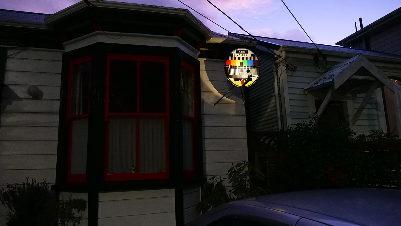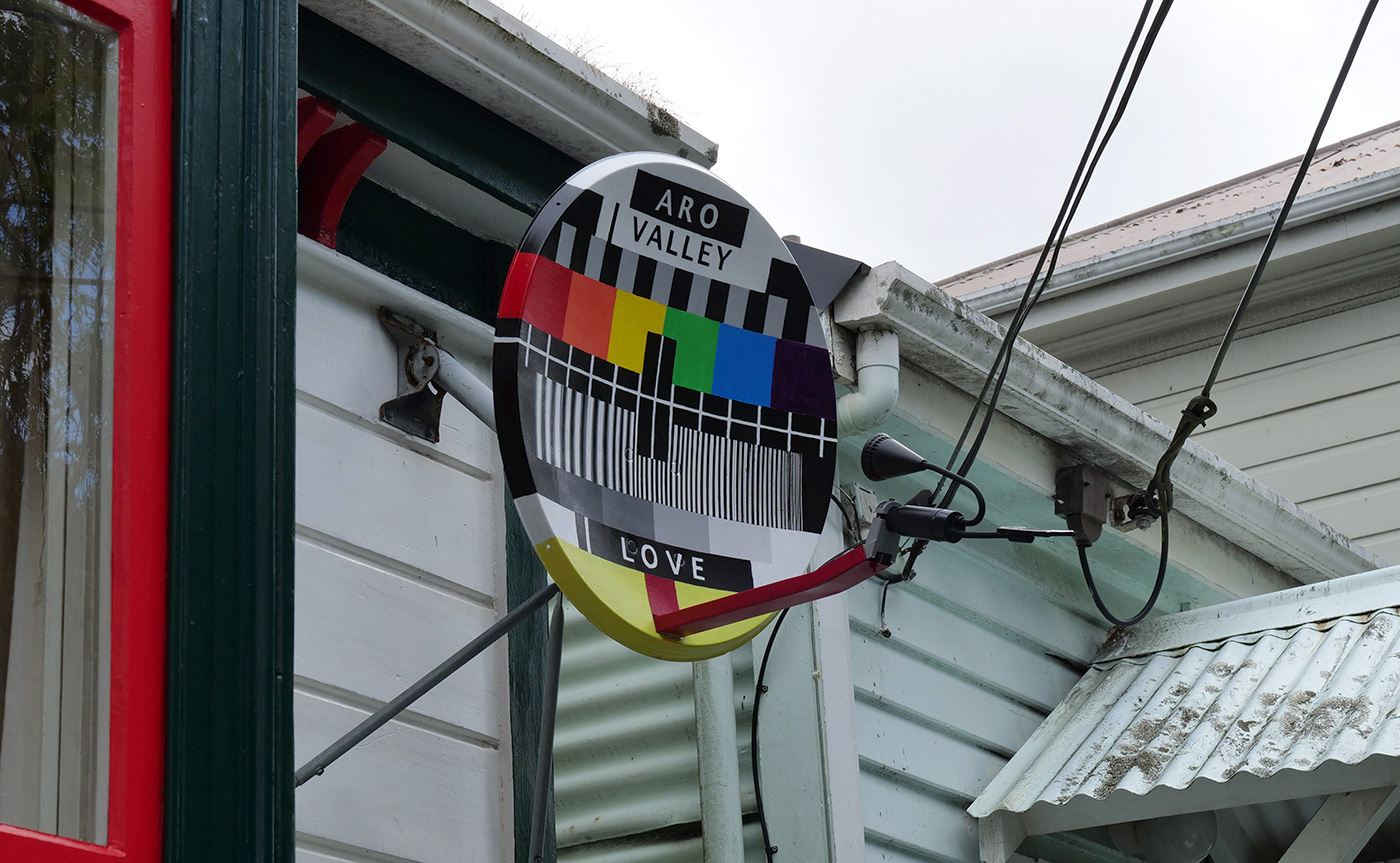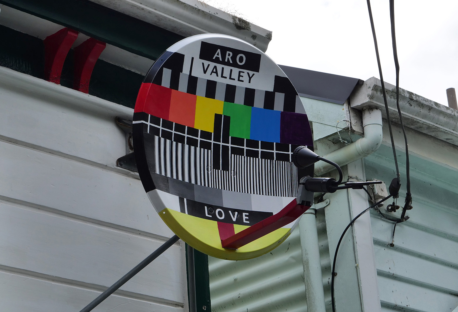 Obsolete satellite dish painted with acrylic and retrofitted with a solar light, which automatically switches on at night.