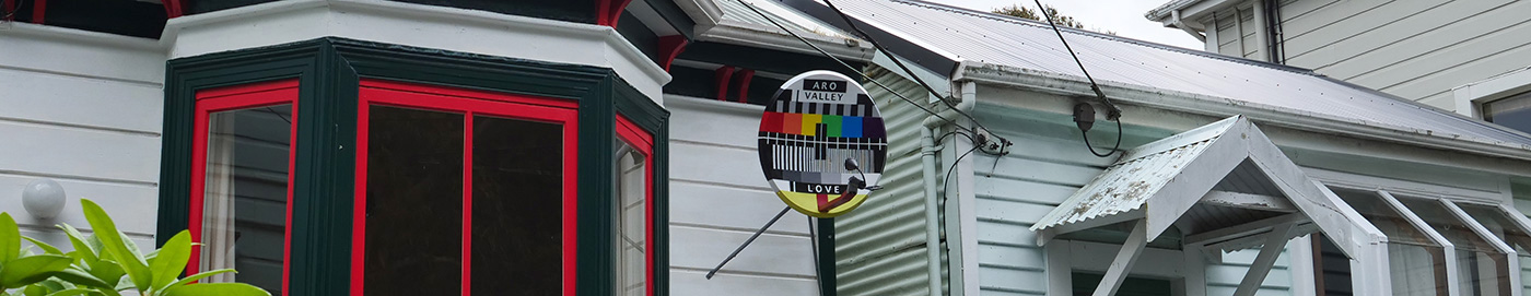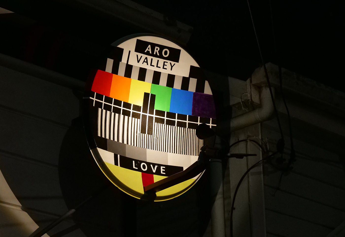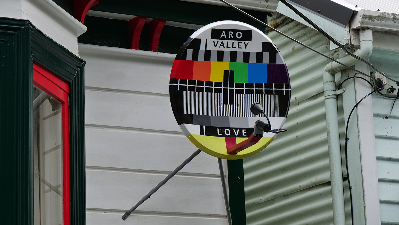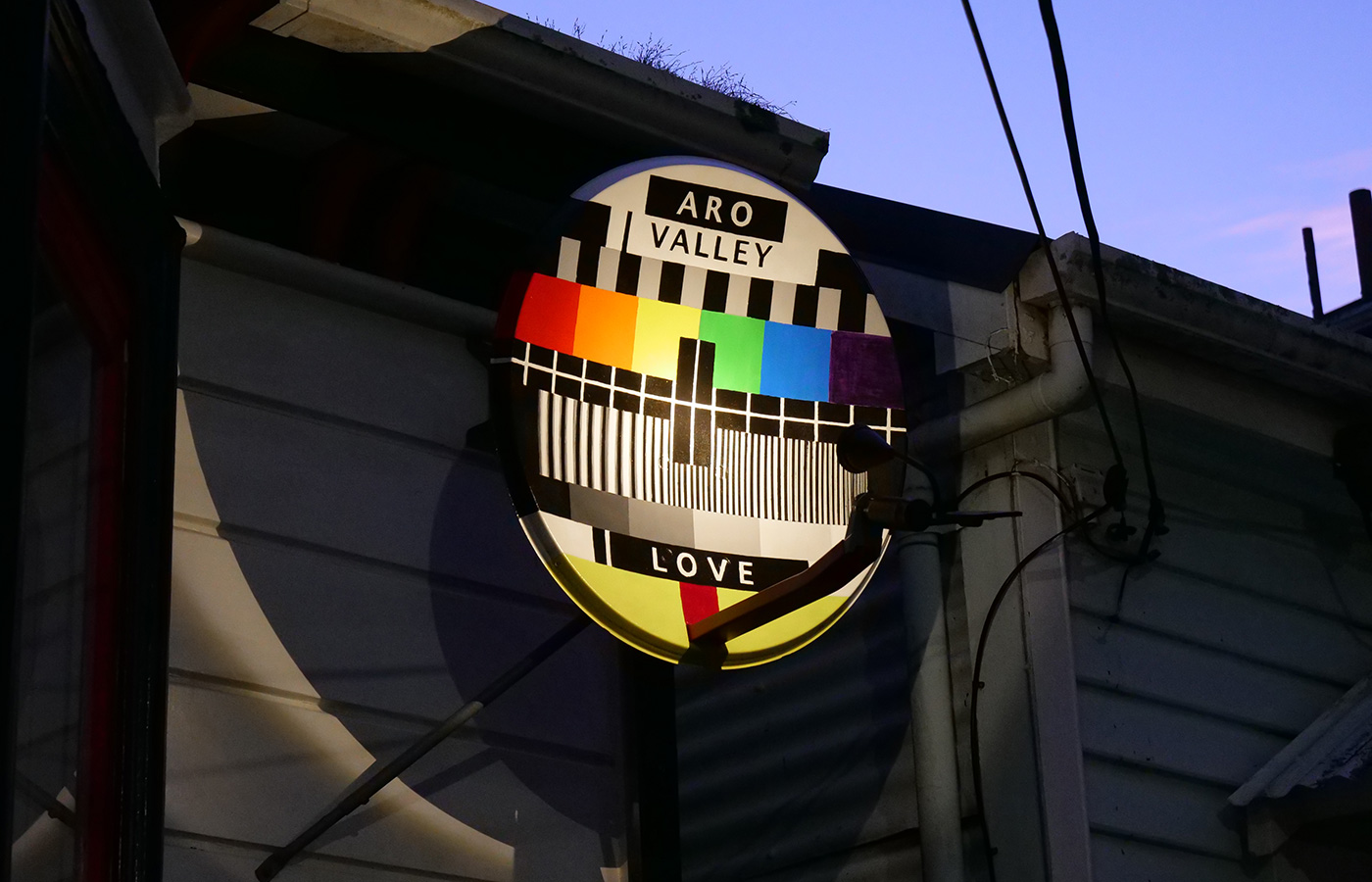 Obsolete satellite dish painted with acrylic and retrofitted with a solar light, which automatically switches on at night.