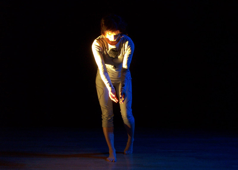 The Standing Waves performance system involves wearable electronic sensor technology to allow a dancer to interact with a malleable sound environment. Sensing the body, its gestures and its environment through the measurement of light and acceleration, the “sensor suit” allows the dancer to intuitively control sound. The dancer can choose to expose or hide light-sensitive parts of the sensor garment, combining these actions with movements of varied speed. In turn, the sonic feedback influences the emerging choreographic score, inducing constraints and generative cyclic patterns for movement. This feedback loop between movement and sonic state creates waves of sensation heightening the experience of the space as a perceptible field of embodied technology. The performance exists at the threshold between the figurative and the factual as it takes data and information from the lab practice of a sleep scientist and reinterprets this within the condition of a performance environment, effectively making visible the dynamic processes of physiological phenomena.
