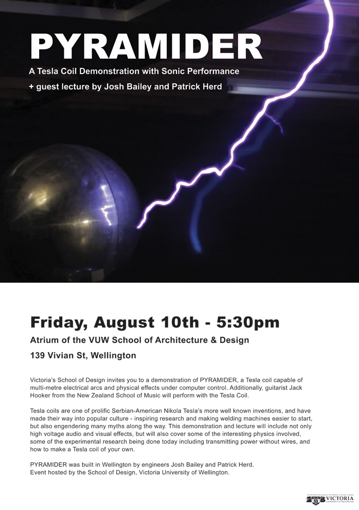Victoria's School of Design invites you to a demonstration of PYRAMIDER, a Tesla coil capable of multi-metre electrical arcs and physical